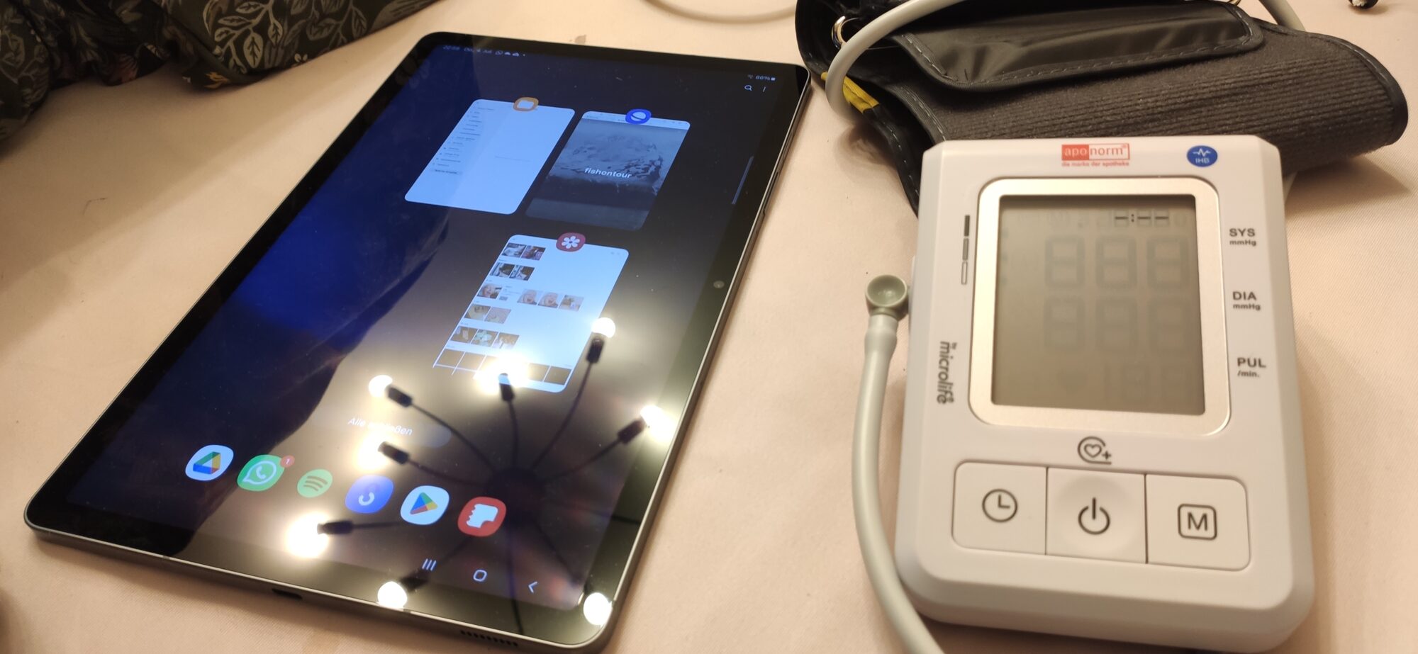 Dafür ein neues Blutdruckmessgerät. Das kann auch unregelmäßigen Herzschlag anzeigen – bisher hat es das aber glücklicherweise gelassen. Daneben Tabby – gestern erst kennengelernt, heute schon voll in love!