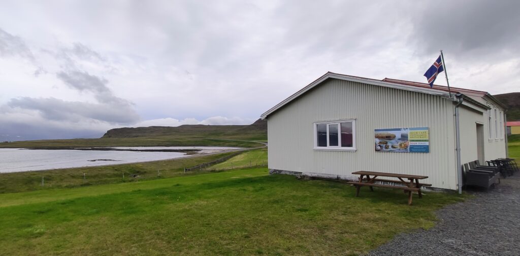 Nach 120 km Nichts fragt man sich dann irgendwann, ob es noch irgendwo Menschen gibt. Vor allem aber, ob es vielleicht auch irgendwo Kaffee gibt. Lola war auch erschöpft und wie meist ziemlich schmutzig. Und dann geschah das Wunder, Ögur tauchte aus dem Nichts auf.