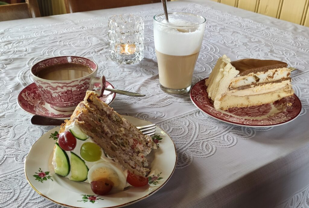 Die linke Torte ist nichts für Vegetarier. Eine Schafstorte quasi. Saulecker, der Isländer kippt auch gern überall massenhaft Majo ran.