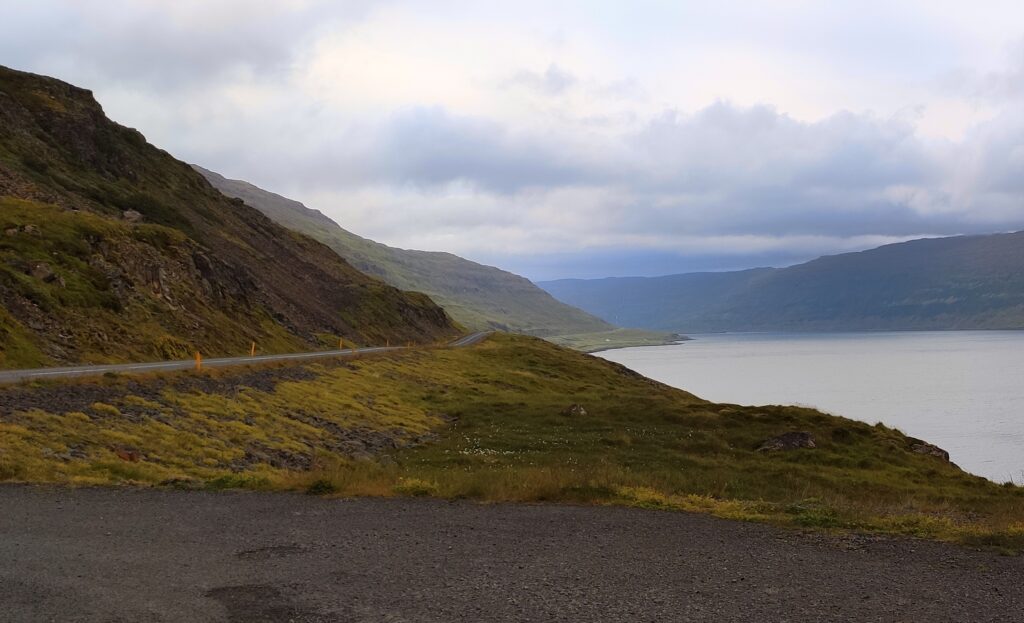 Man wird aber unterwegs gebildet. In den Westfjorden weniger als auf der Ringstraße, weil auch weniger Platz für Parkplätze ist. Links Berg, rechts Meer. Oft weit unten.