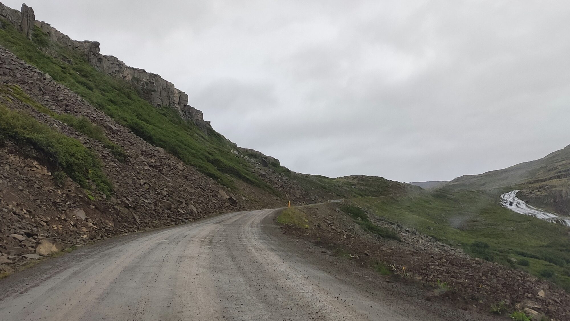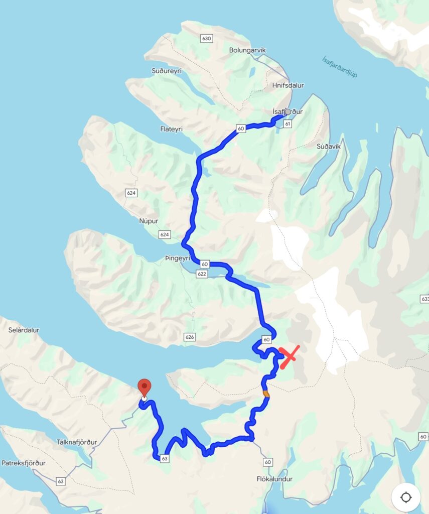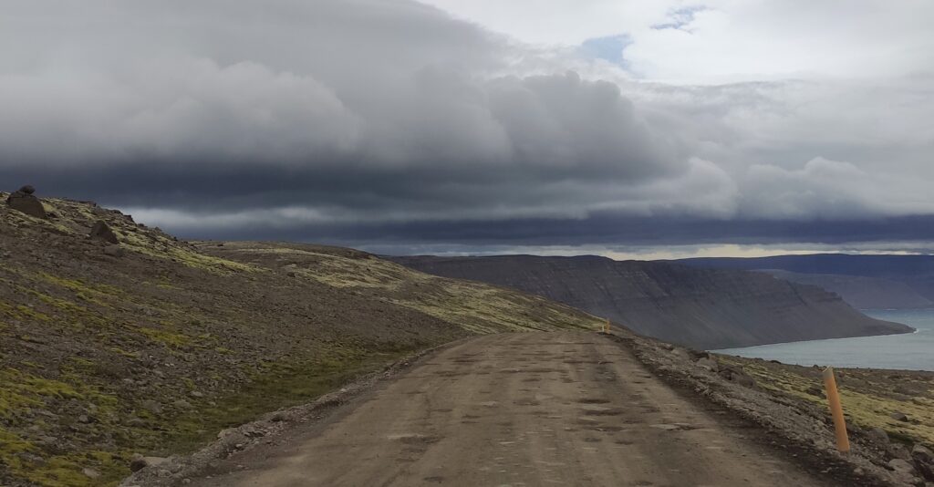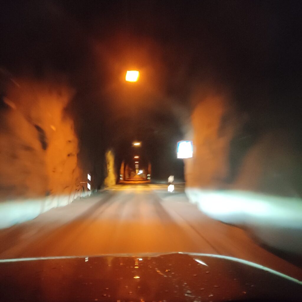 Hinter Isafjördur geht es in einen 6 km langen, grob in den Stein gehauenen Tunnel. Anfangs zweispurig, aber nach einer Abzweigung in einen Ort am Ende der Welt bleibt es einspurig. 4 km lang. Man muss ja alles mal gemacht haben 😁 In regelmäßigen Abständen gibt es mit einem M gekennzeichnete Ausweichbuchten, aber es geht da drin nicht zu wie auf der Autobahn, also kein Problem.