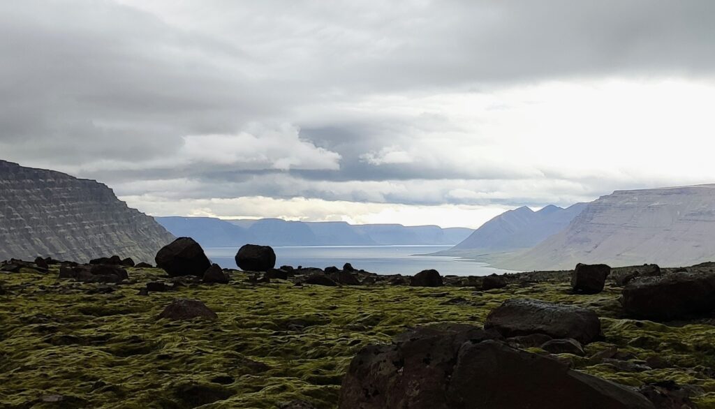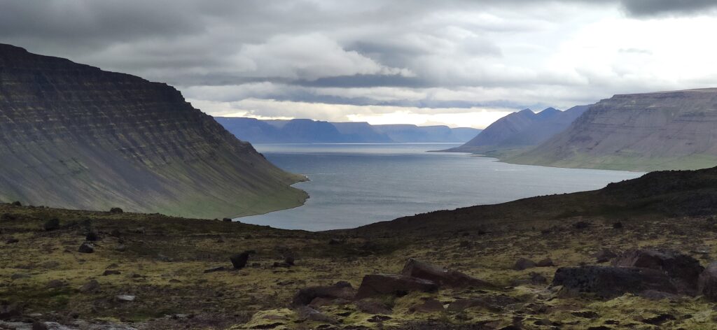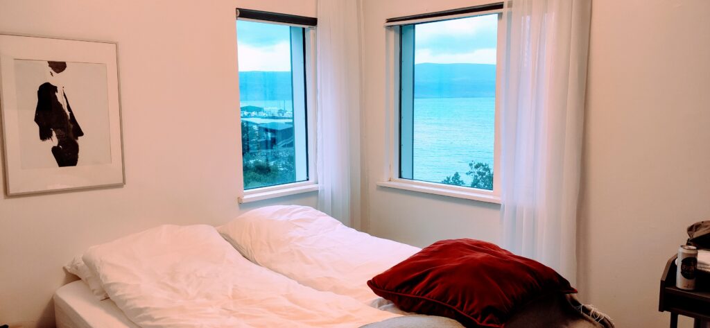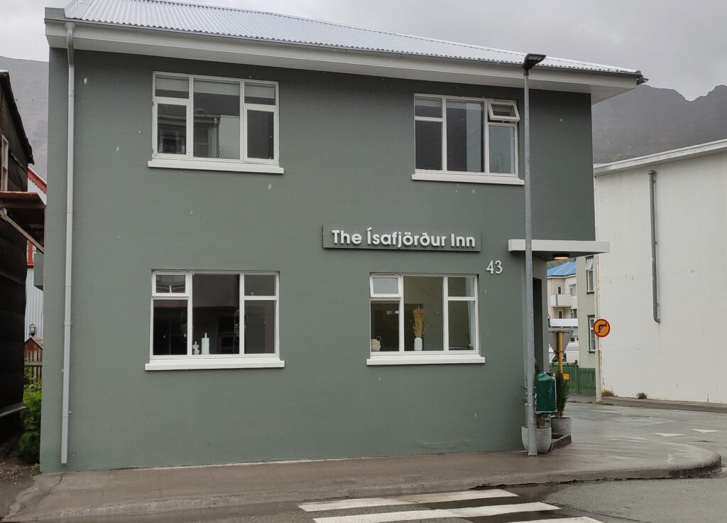 Fosshestar ist ein kleinerer Pferdehof bei Isafjördur und dort hatten wir für 14 Uhr einen Ausritt gebucht. 10 Uhr war schon ausgebucht, was sich als segensreich erwies, weil um 10 regnete es noch ordentlich. Im selbst für Island hypermodernen Isafjördur Inn konnten wir bis halb 12 bleiben. Auf Island gibt es übrigens selten so etwas wie eine Rezeption, man bekommt per Mail Codes, mit denen man die Tür oder eine Schlüsselbox öffnen kann. Praktisch bei später Ankunft – wenn man sich nicht zu blöd anstellt 😄
