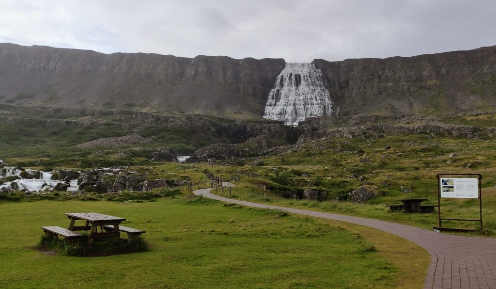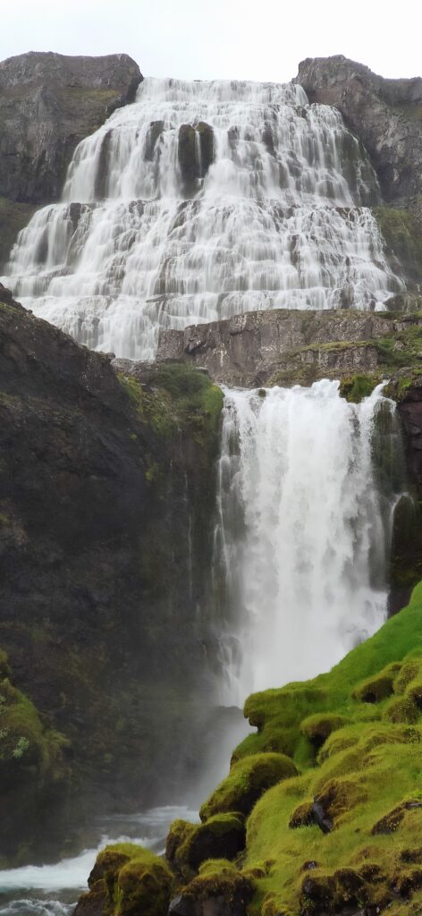 Nach der Überquerung einer kleinen Heidi dann ein Must See, der Dynjandi Wasserfall. Leider bei Nieselregen und immer stärkerem Wind, trotzdem sehr beeindruckend. Wir krabbelten nur das letzte Stück nicht mehr hoch, es war zu glitschig.