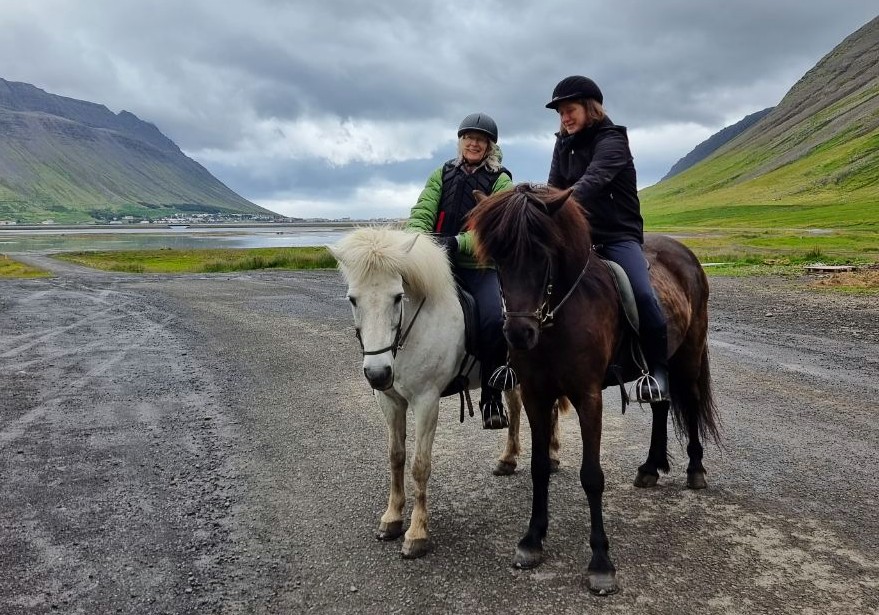 Dann wurden wir von Annika von Fosshestar abgeholt, die konvenienterweise aus Deutschland kommt und im Sommer vor dem Studium dort einige Monate arbeitet. Wäre früher mangels eigenem Pferd auch mein Traumjob gewesen! Sie machte es wirklich toll, erzählte eine Menge über die Islandpferde und weihte uns ins Tölten ein, die Gangart der Isländer. Ist wie Fliegen, wenn man sich dran gewöhnt hat. Wir sind beide früher viel geritten, aber vor allem bei mir ist es ca. 3000 Jahre her. Deshalb gingen wir es vorsichtig an, aber nach kurzer Zeit fühlten wir uns auf den Pferden wieder ganz zuhause 🥰😍🤩