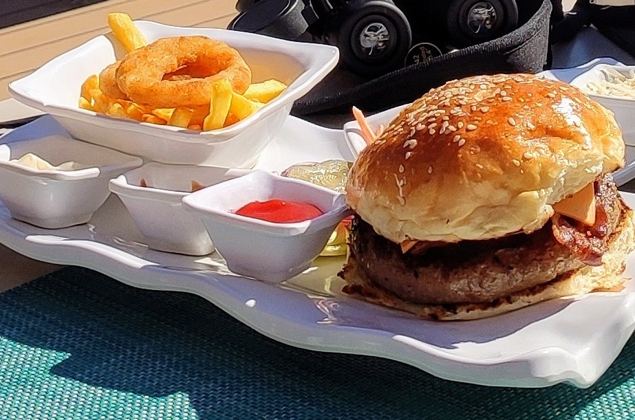 Mittags gab es für mich den natürlich auch spektakulären Silverwind-Hamburger. Die Frau bevorzugt New York Cheesecake. Alles mit Kulisse.