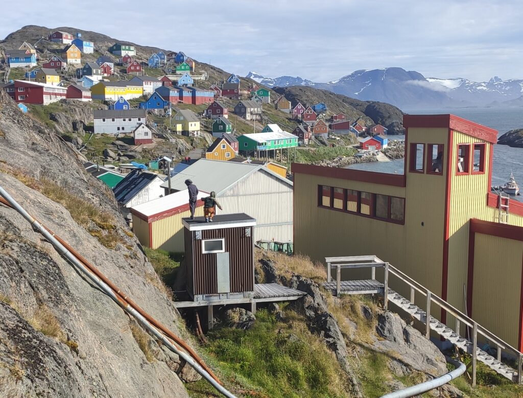 Die grönländischen Settlements liegen in der Regel an steilen Hängen. Die Häuser sind mit abenteuerlichen Treppenkonstruktionen erreichbar.