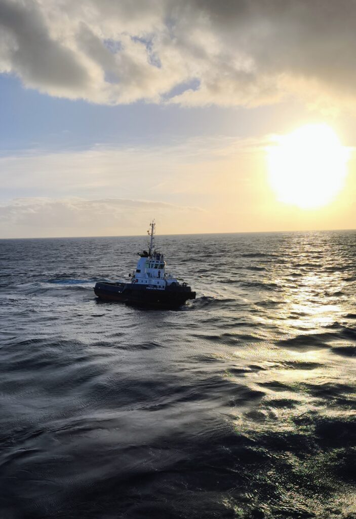 Ein Schlepper ist in vielen Häfen Pflicht. Wobei der wie hier oft gar nicht schleppen muss, aber trotzdem paar Tausend Euro allein für das um’s Schiff Herumtanzen bekommt.
