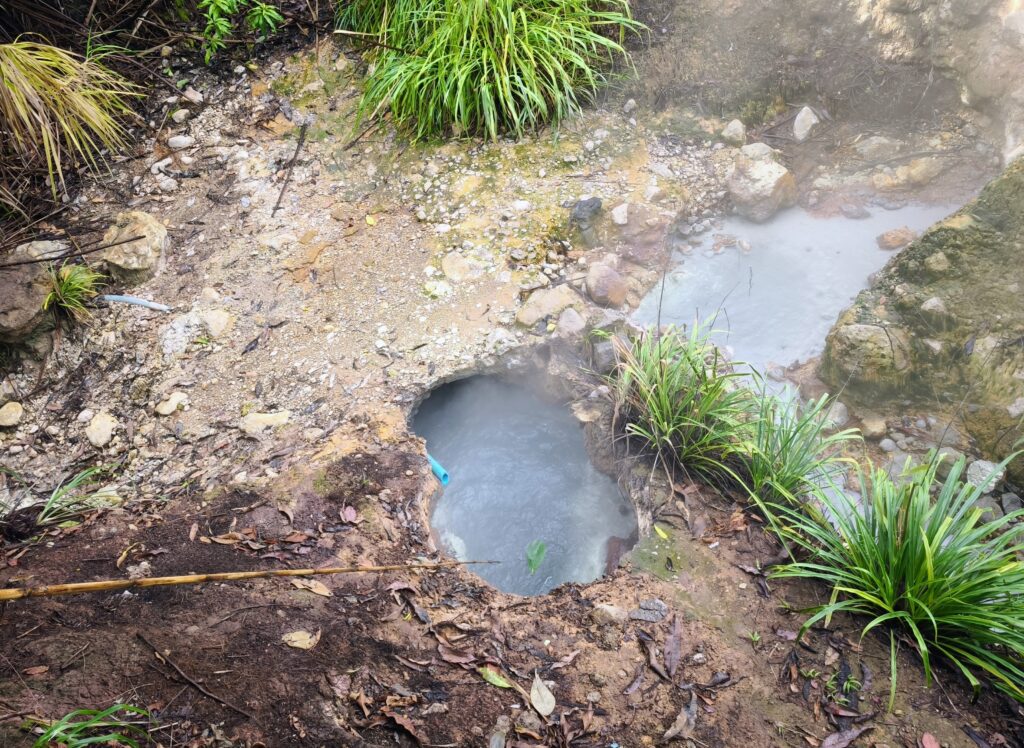 Der aktive Vulkanismus beschränkt sich derzeit auf schweflige heiße Quellen. Baden waren wir nicht ….