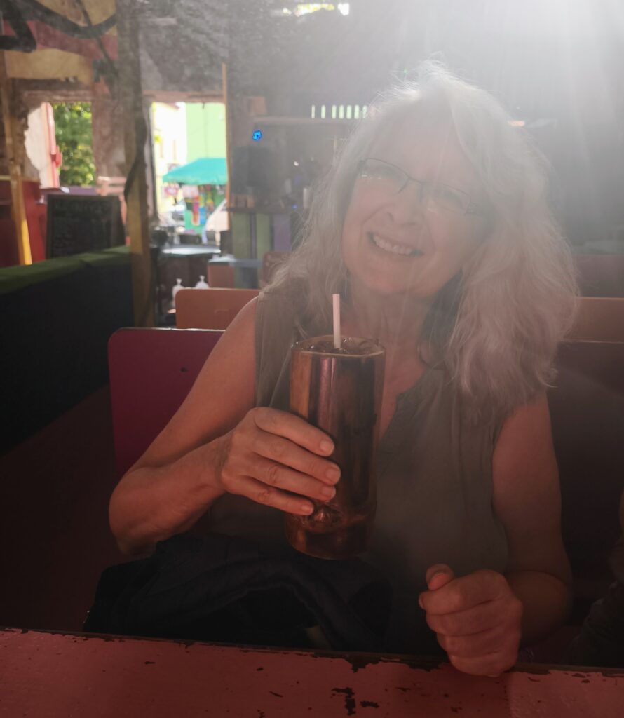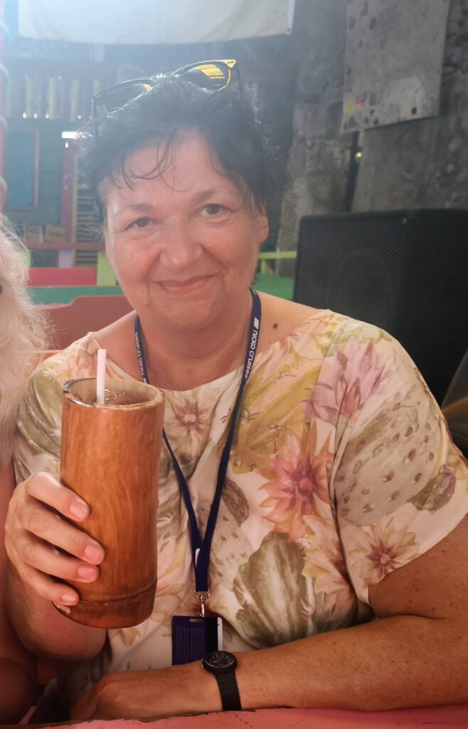 Mit Bier auf Nummer sicher gehende Touristin und zwei sich dem Rumpunsch ergebende Touristinnen. Alle fröhlich.